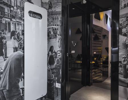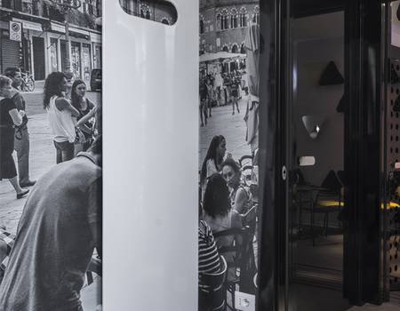 Der Minimalismus des Badge Heizkörpers schafft einen sensorischen Bruch innerhalb der Heterogenität der städtischen Umgebung. Der in weiss präsentierte Heizkörper hebt sich zwischen den Wänden ab und unterstreicht seine kompakte und geradlinige Form.