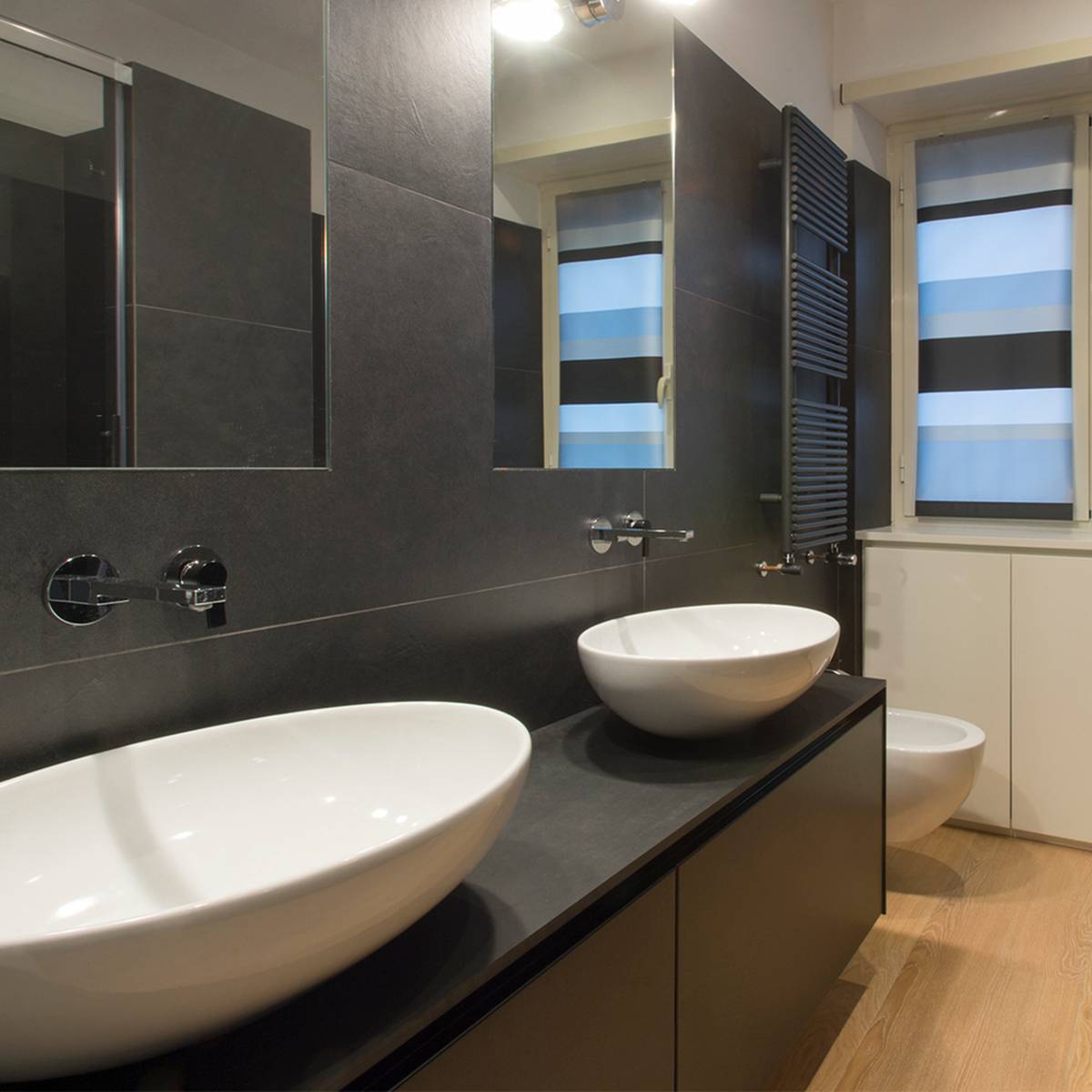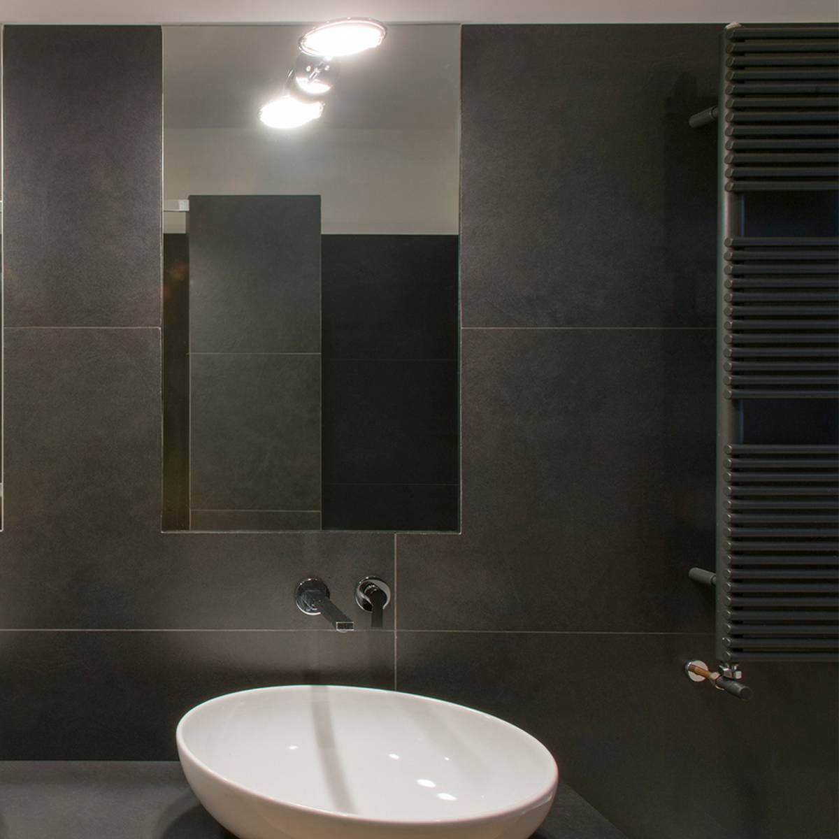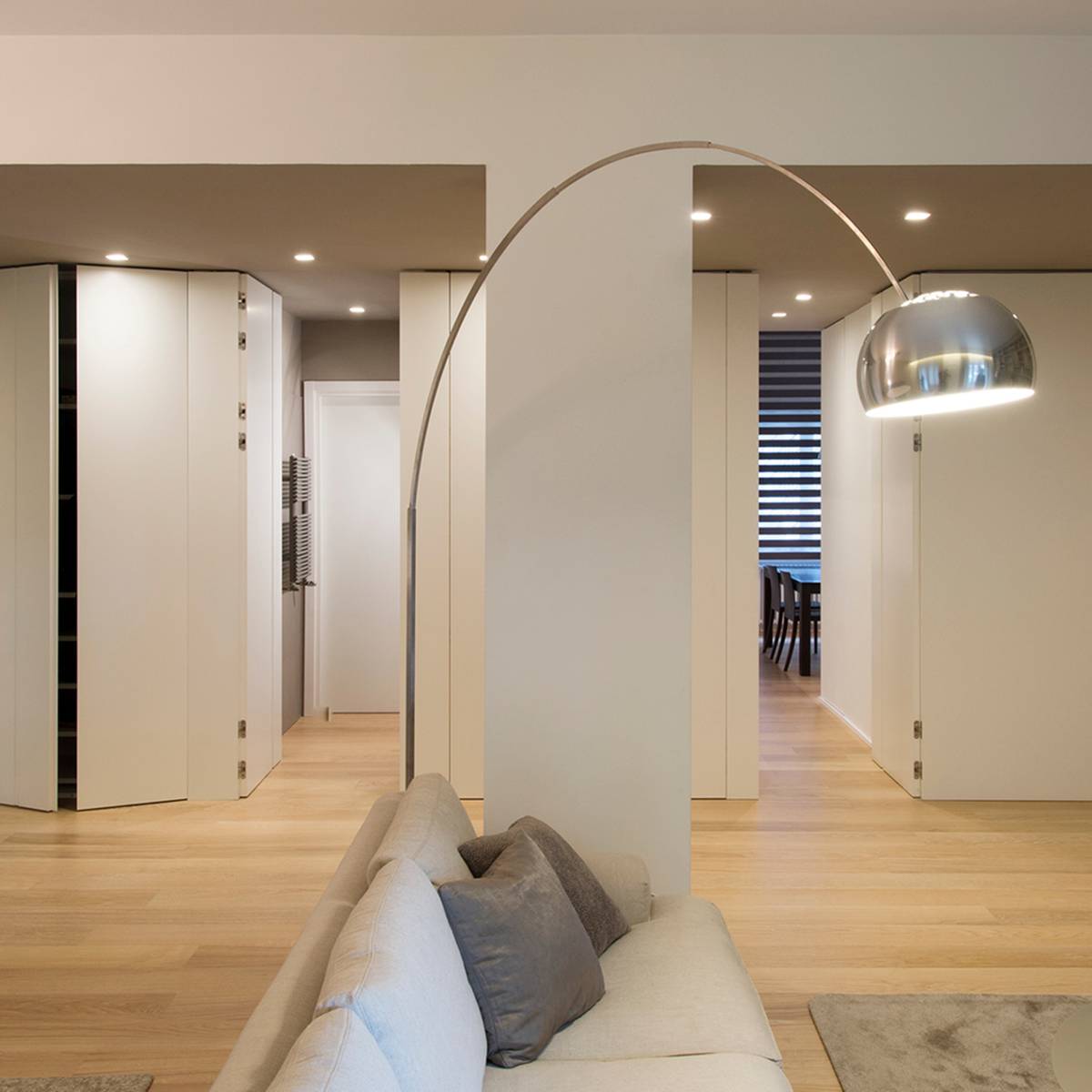 The apartment, completely renovated by the ArchiFacturing architecture studio, has been entirely turned upside-down. Architects Sara Cimarelli and Giorgio Opolka, specialised in architecture and interior design, focused on the re-shaping of the entire apartment using many custom furniture solutions in order to achieve a unique and impeccable final result, of great style. A peculiar feature is the presence of a large wall boiserie hiding two large closets as well as the entrance to both the kitchen and the service area, dividing the spaces in an original and absolutely elegant way. The use of furnishings that have made design history refine the already impressive picture. The Cordivari Ardesia radiators and the Lucy towel rails were chosen for the bathroom.