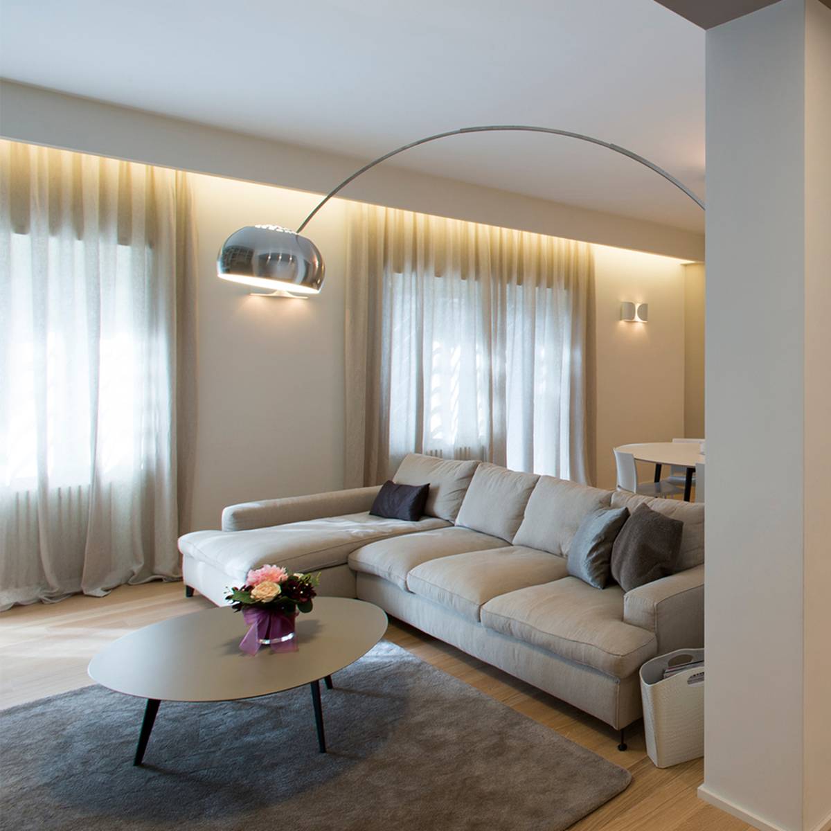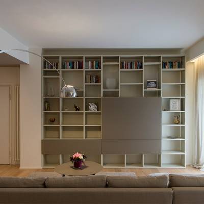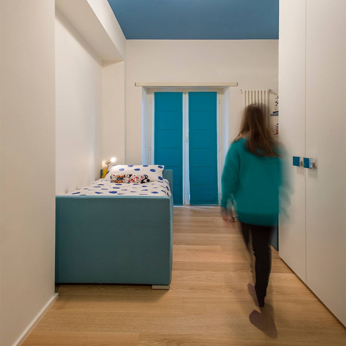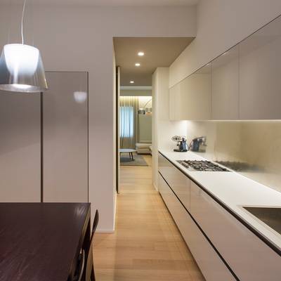 The apartment, completely renovated by the ArchiFacturing architecture studio, has been entirely turned upside-down. Architects Sara Cimarelli and Giorgio Opolka, specialised in architecture and interior design, focused on the re-shaping of the entire apartment using many custom furniture solutions in order to achieve a unique and impeccable final result, of great style. A peculiar feature is the presence of a large wall boiserie hiding two large closets as well as the entrance to both the kitchen and the service area, dividing the spaces in an original and absolutely elegant way. The use of furnishings that have made design history refine the already impressive picture. The Cordivari Ardesia radiators and the Lucy towel rails were chosen for the bathroom.