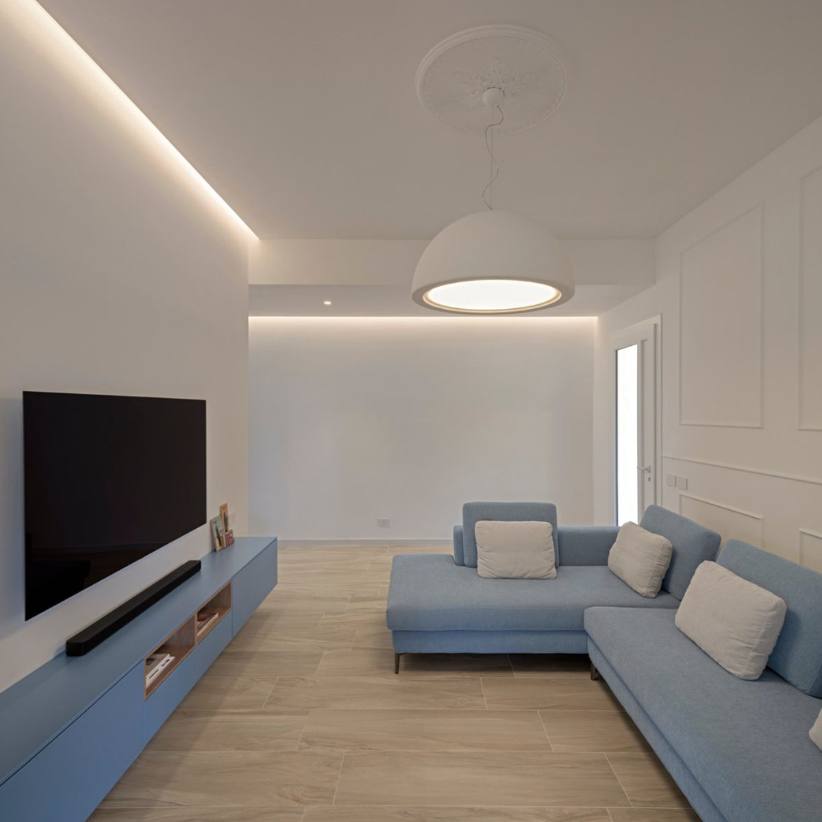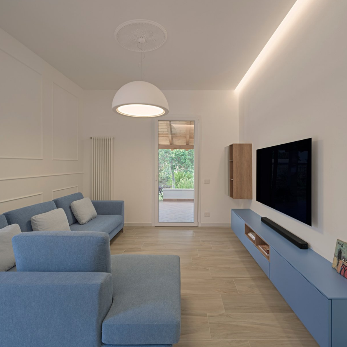 L'objectif principal du projet était d'apporter plus de lumière naturelle à l'intérieur, en remodelant les surfaces vitrées et la distribution des pièces. L'harmonie des intérieurs rappelle la tranquillité du paysage sicilien, dans lequel les éléments d'ameublement visent à accentuer, grâce également au jeu de lumière, la connexion entre les espaces et le désir de les traverser pour renouer avec la nature environnante.