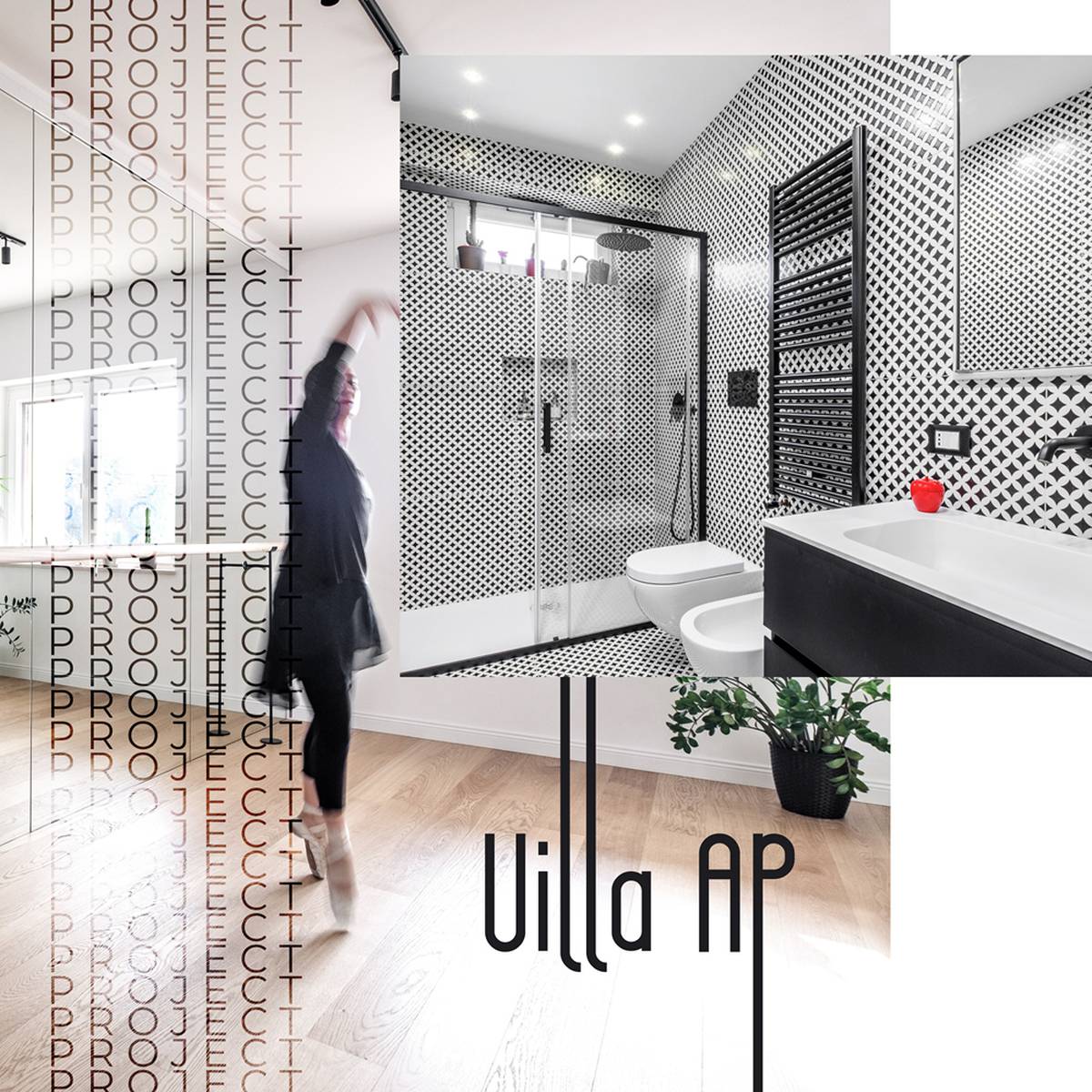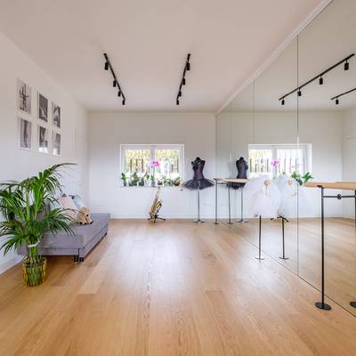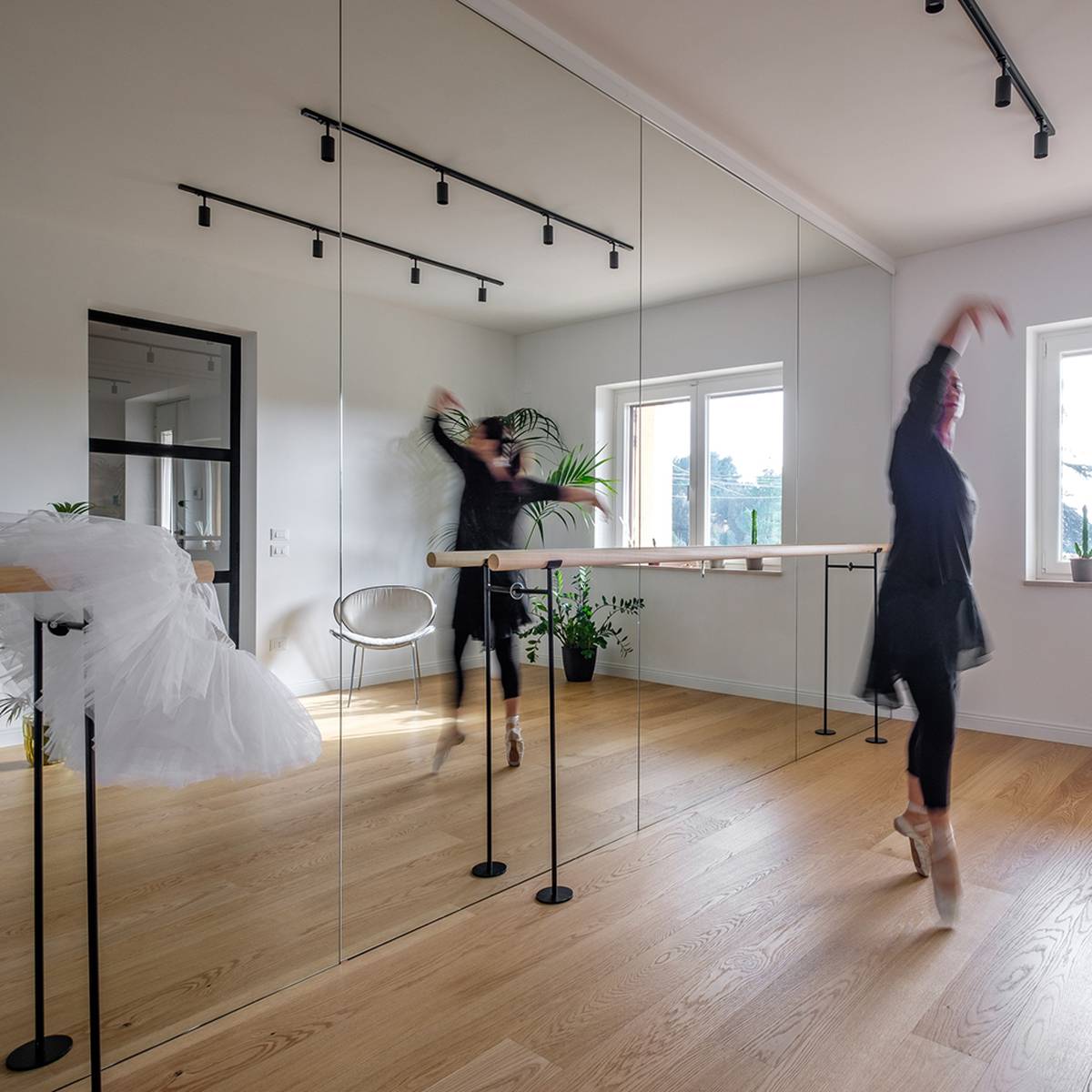L'élément caractéristique de l'ensemble du projet est la salle de danse, un espace lumineux de 20 mètres carrés avec un mur et un bar entièrement en miroir pour un parfait exercice de discipline.