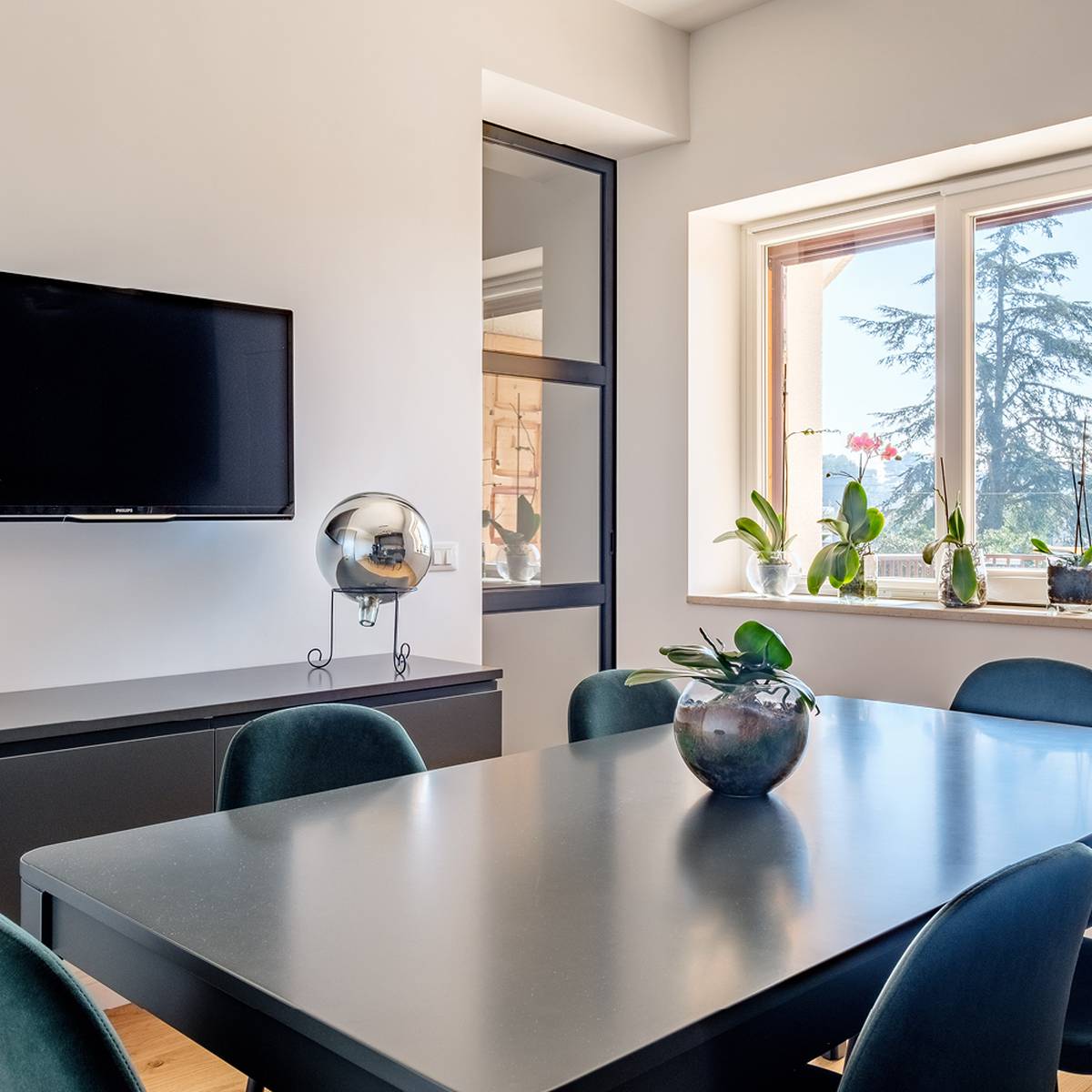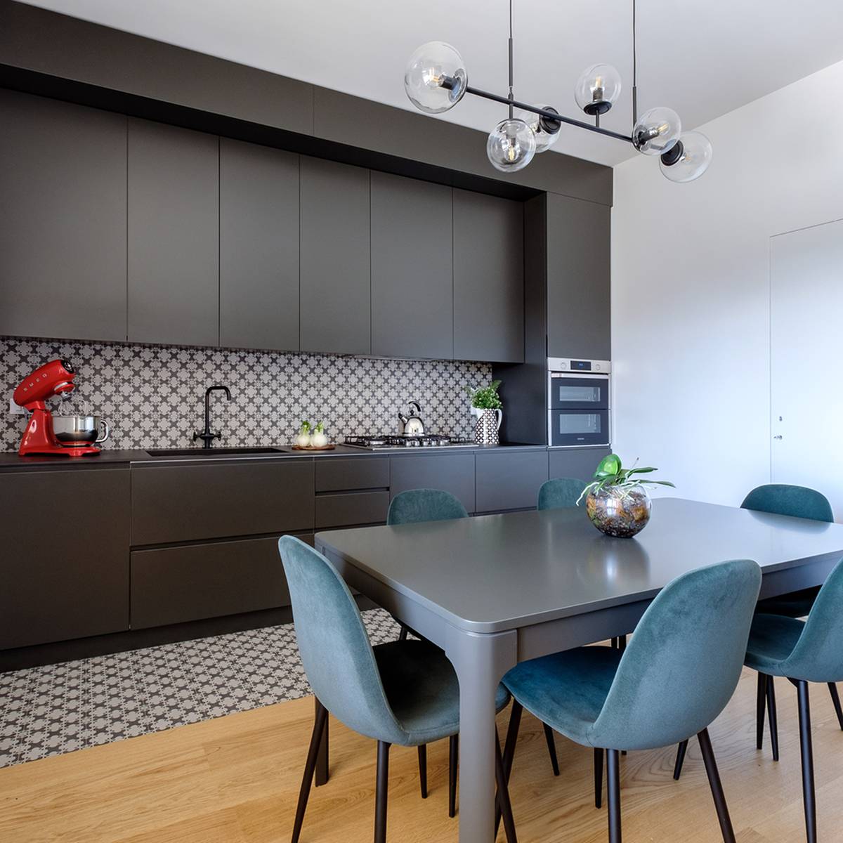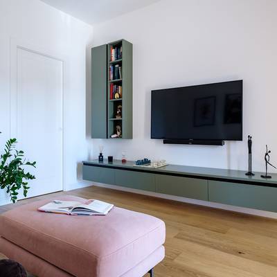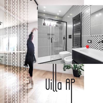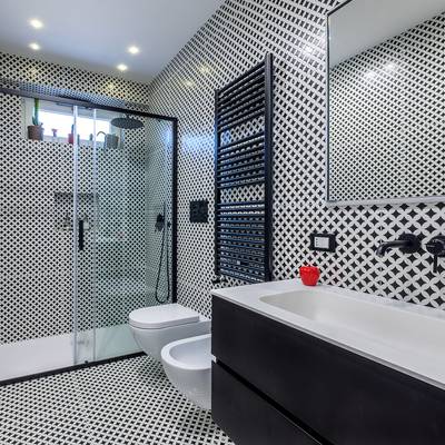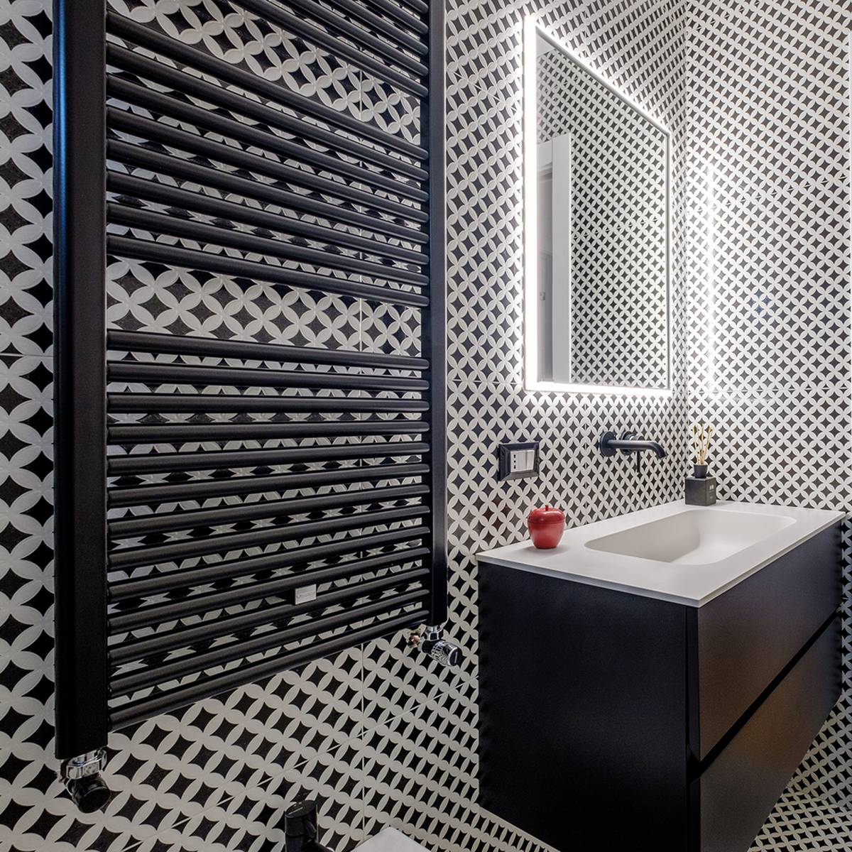 La cuisine, également conçue sur mesure, se fond avec la salle à manger dans un mélange de fonctionnalités et de couleurs sombres qui donnent à l'environnement une touche décisive et de caractère. Une grande buanderie aménagée en continuité avec le mur de la cuisine dessert cet espace de vie. La chambre est présentée avec des couleurs audacieuses et excentriques, ainsi que la salle de bain qui, grâce aux dessins géométriques en « noir et blanc » des carreaux qui remplissent complètement les murs, se caractérise par un design original avec beaucoup de caractère. Claudia, le sèche-serviettes par excellence aux lignes classiques et intemporelles de Cordivari, de couleur Noir, trouve une place parfaite dans cette salle de bain au style décisif.