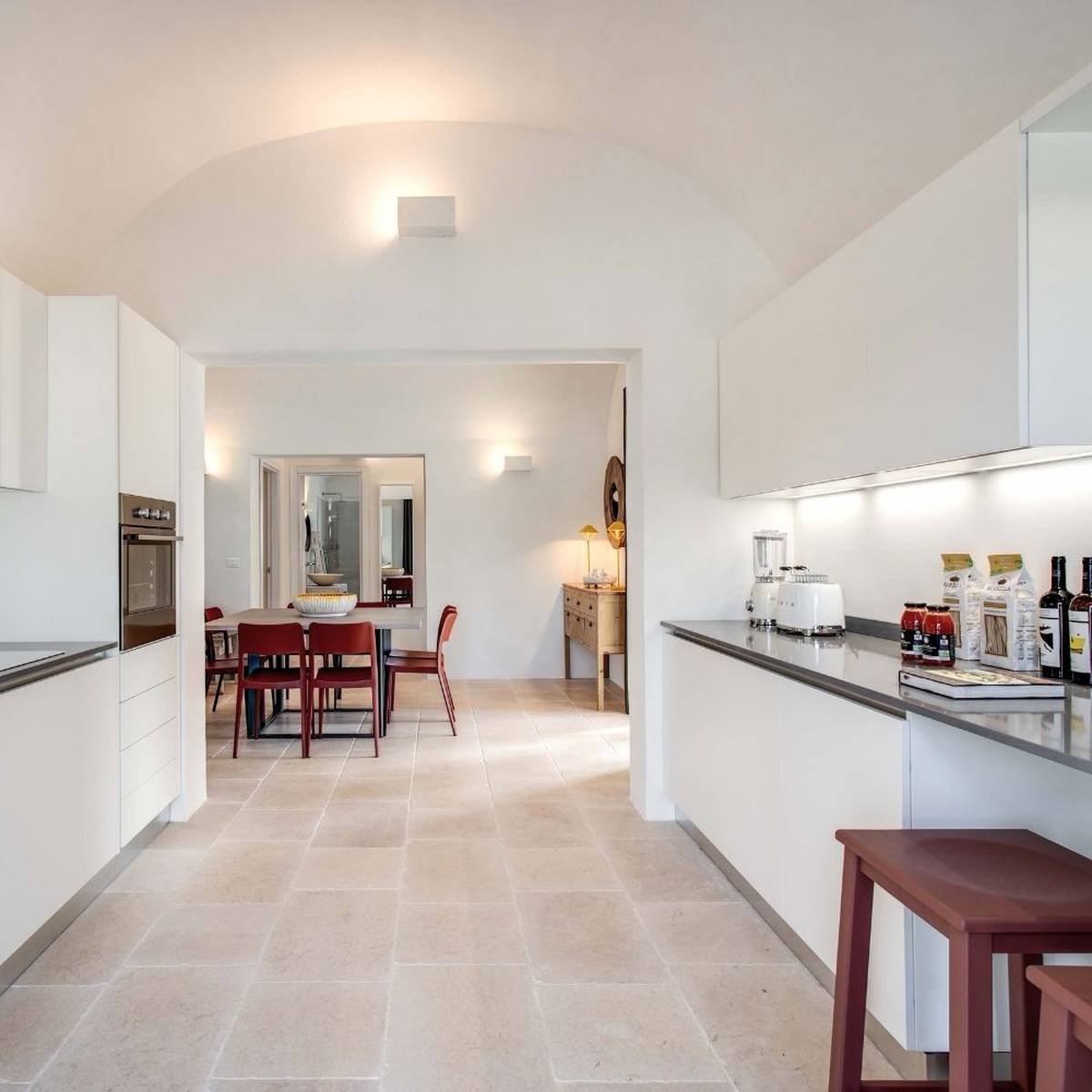 Il progetto realizzato dall’architetto di interni Gian Paolo Guerra ha interessato sia la progettazione e l’arredo degli interni, sia l’allestimento dell’area esterna. Grazie al lavoro di progettazione e di restauro degli spazi esistenti (il vecchio trullo saraceno) e del giardino con la piscina e l’idromassaggio, la villa diventa una vera dimora di charme.